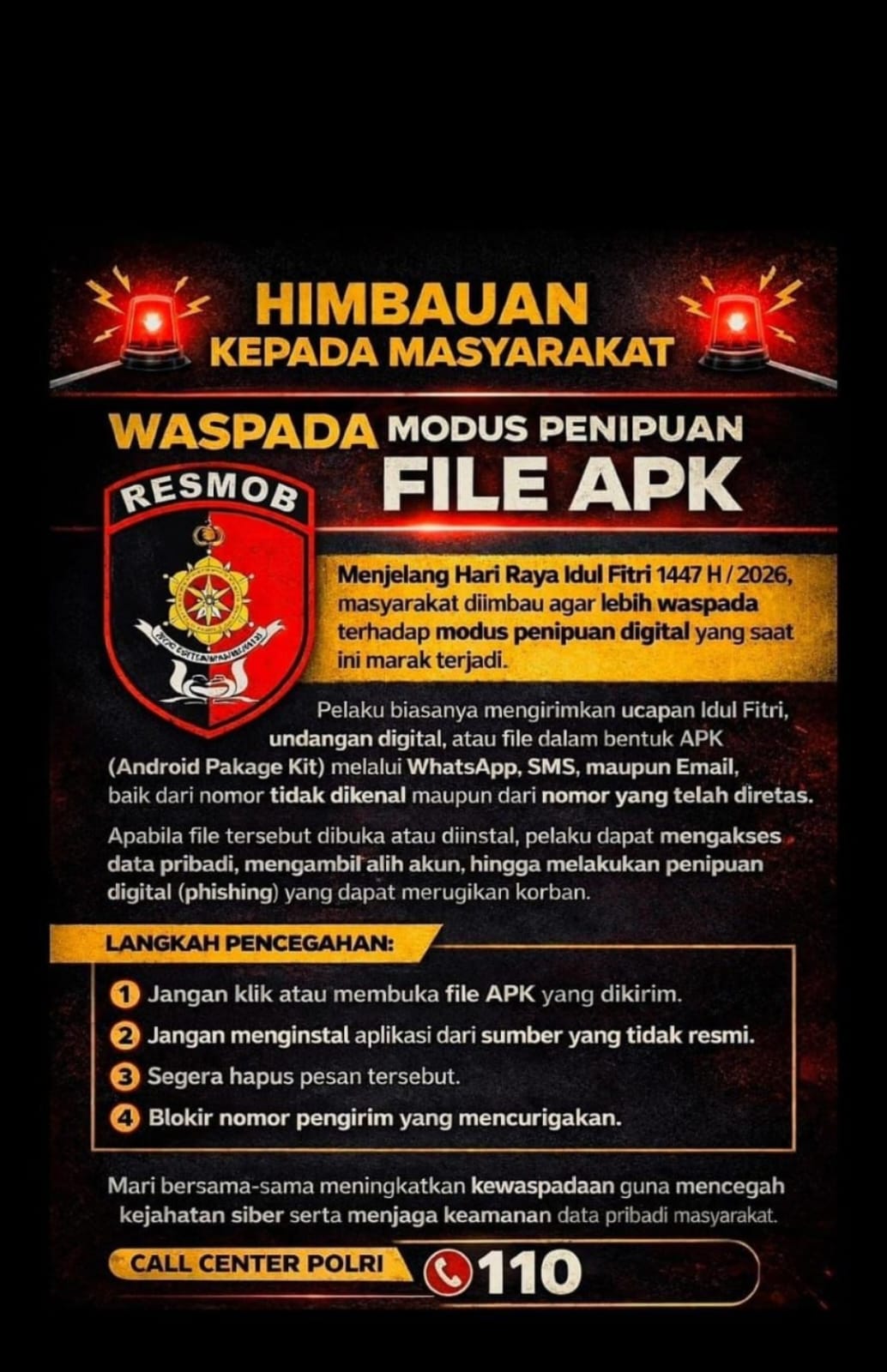 Dukungan ini sejalan dengan peringatan dari kepolisian agar warga waspada terhadap pesan WhatsApp, SMS, maupun Email berisi ucapan Idul Fitri atau undangan digital yang menyertakan file APK dari nomor tidak dikenal. File tersebut diketahui dapat mengambil alih data pribadi hingga menguras isi rekening korban (phishing).