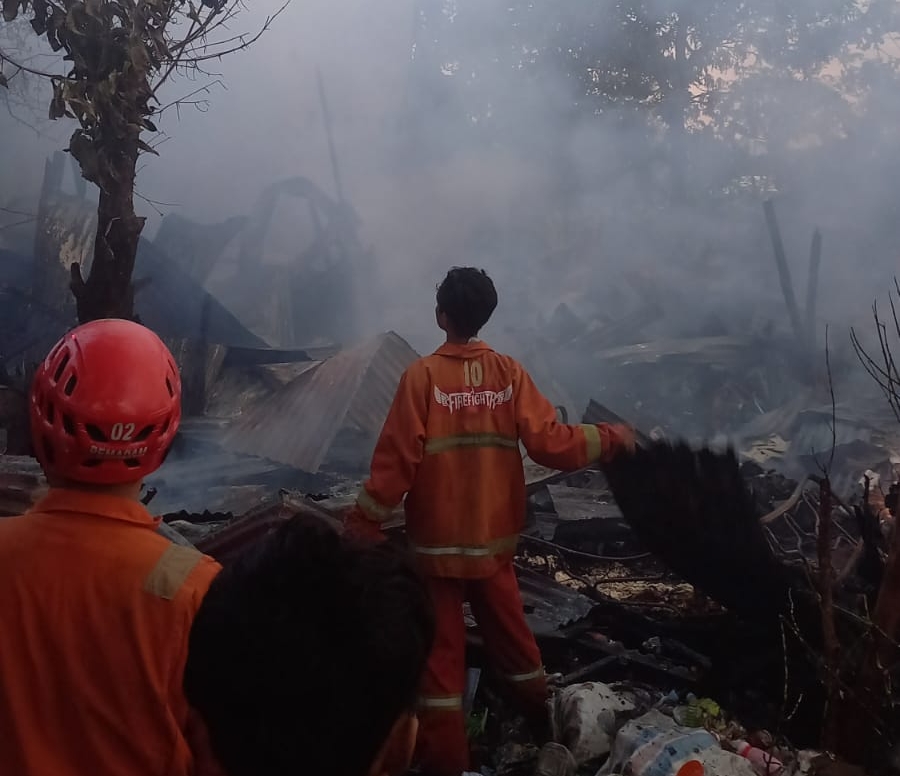 Petugas pemadam kebakaran dan juga warga sekitar masih berada disekitar lokasi kebakaran.