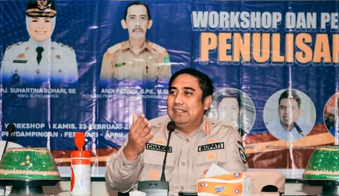 Bupati Maros Chaidir Syam hadir sebagai salah satu narasumber di workshop itu. Ia mengajak para guru peserta workshop untuk berkarya lewat buku.
