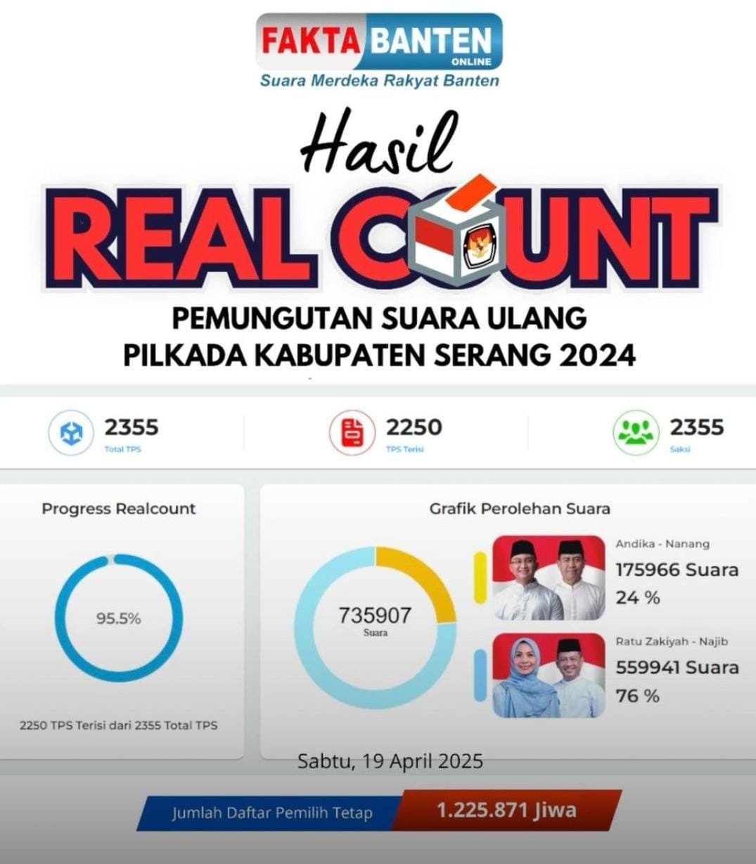 Serang. Kameraliputan.com – Kemenangan pasangan calon Bupati dan Wakil Bupati Serang, Ratu Zakiyah dan Najib Hamas, dalam Pemungutan Suara Ulang (PSU) Pilkada Kabupaten Serang 2025.,Sabtu (19/04/2025).