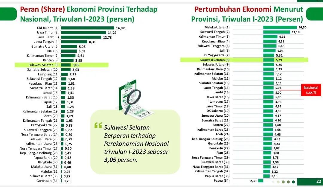 Jika berdasarkan Provinsi, pertumbuhan ekonomi Sulsel berada pada urutan ke 8 se Indonesia. Provinsi Sulsel berperan terhadap perekonomian Nasional 3,05 persen.