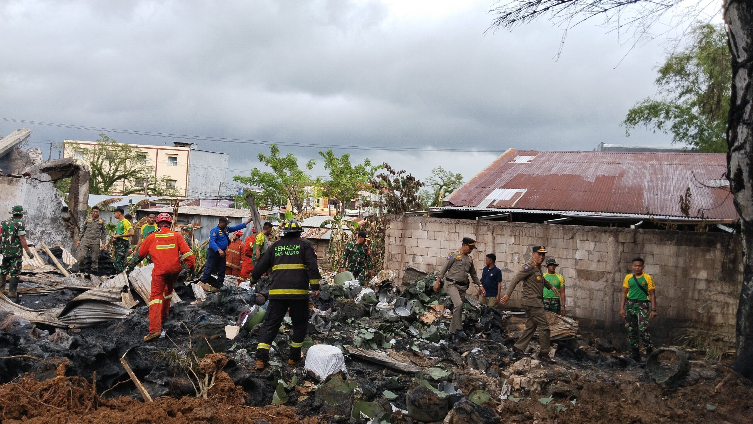 Mereka membantu proses pendinginan dan pembersihan pada sisa-sisa api yang masih mengepulkan asap.