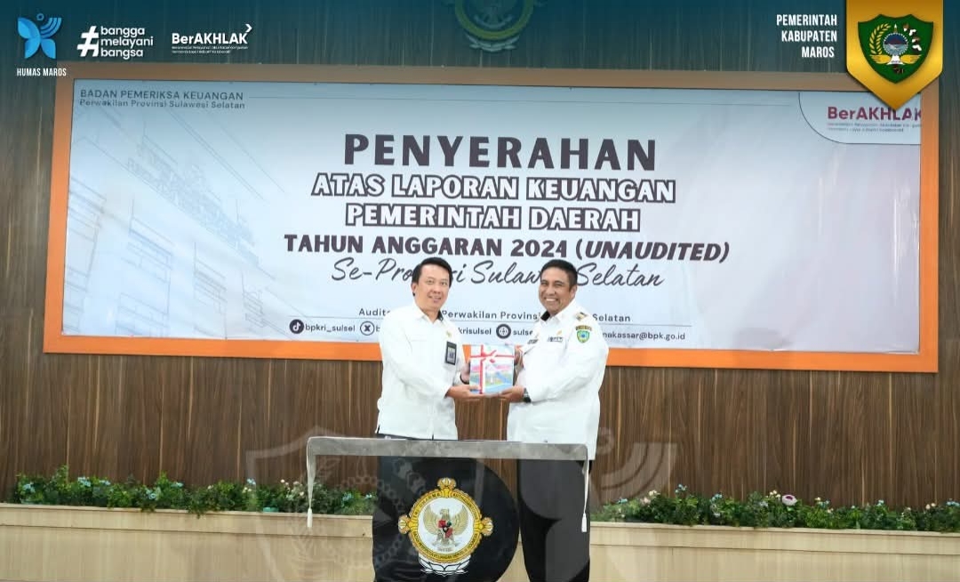 Maros. Kameraliputan.com – Bupati Maros, Dr.H.A.S Chaidir Syam, S.IP., M.H., beserta kepala daerah se-Provinsi Sulawesi Selatan, menyerahkan Laporan Keuangan Pemerintah Daerah (LKPD) Kabupaten Maros tahun anggaran 2024 kepada Badan Pemeriksa Keuangan (BPK) Perwakilan Sulawesi Selatan.