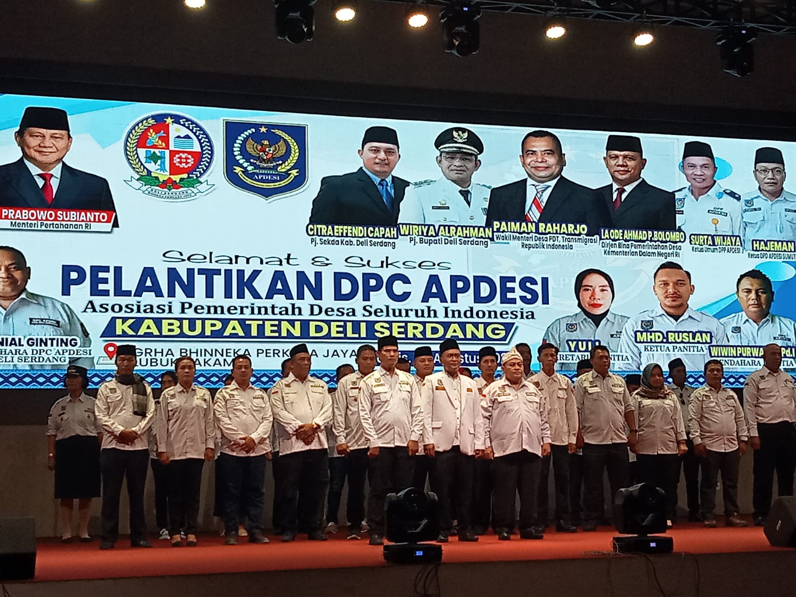 Deli Serdang. Kameraliputan.com.,- Pelantikan Asosiasi Kepala Desa Seluruh Indonesia (APDESI) Deli Serdang Hardono siap kawal pembangunan Desa tertinggal dihadiri oleh Wakil Menteri Desa Pembangunan Daerah Tertinggal Dan Transmigrasi Republik Indonesia Prof.Dr.H.Paiman Raharjo,M.Si. tepatnya di Graha Perkasa Jaya Sebrang Depan Kantor Bupati Deli Serdang.,Kamis (08/08/2024).