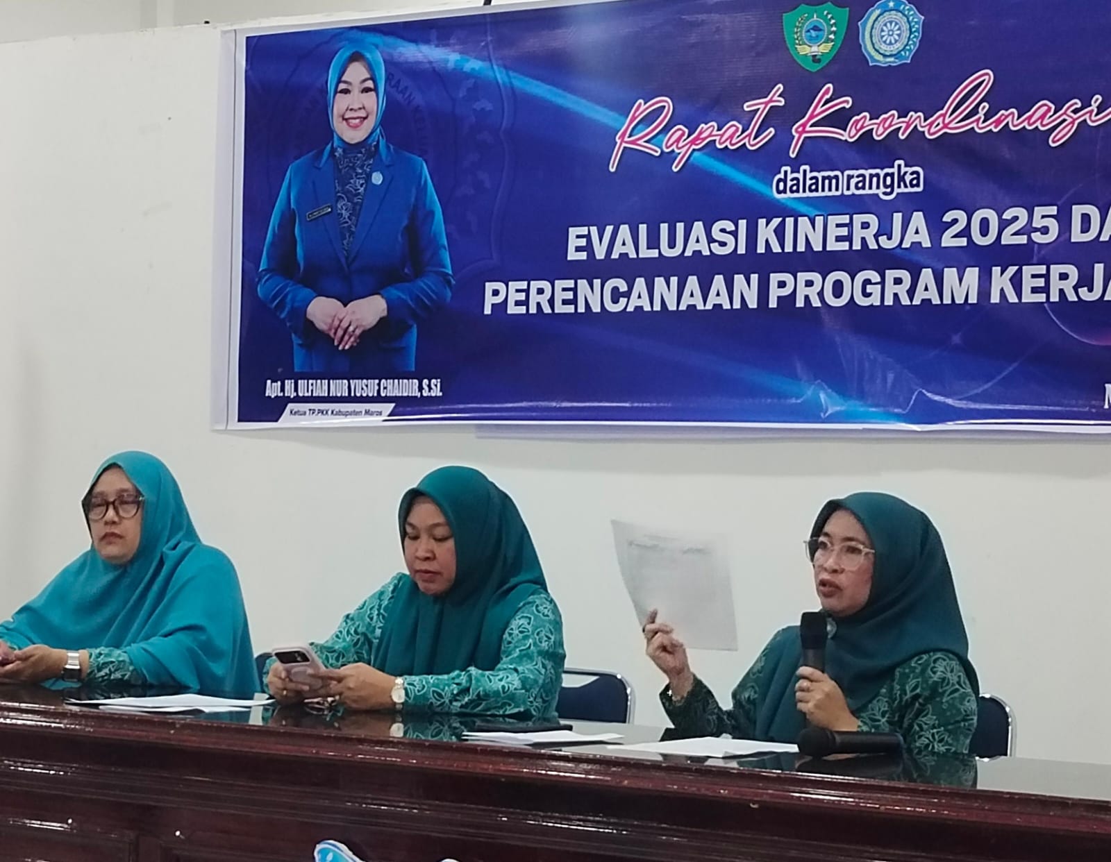 Rapat koordinasi tersebut dibuka secara resmi oleh Ketua TP PKK Kabupaten Maros, **Apt. Hj. Ulfiah Nur Yusuf Chaidir, S.Si.**, didampingi Sekretaris I **Fitriani Syamsuar** dan Ketua Bidang II **Andi Indira Kusumasari Davied**. Kegiatan ini dihadiri oleh seluruh pengurus TP PKK Kabupaten Maros, termasuk para Ketua Kelompok Kerja (Pokja) I hingga IV.