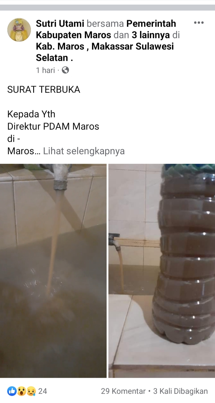“kurang lebih sekitar 10 tahun ini air PDAM Maros yang mengalir di rumah itu sudah tidak layak minum, tidak layak komsumsi. Saya katakan kurang lebih 10 tahun itu karena kurang lebih sudah 10 tahun orang tua saya memilih untuk membeli air kemasan botol dan galon karena melihat tiap hari air PDAM Maros mengalir keruh, sudah tidak layak minum. Kadang saya temukan ada cacing-cacing halusnya dan tiap hari lumpur yang mengendap di dasar bak mandi,” unggahnya.